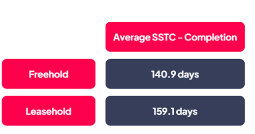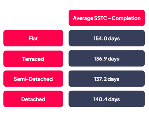 As expected, flats take the longest to transact at 154 days, thanks to leasehold complications. Terraced houses are the quickest to reach completion at nearly 137 days. The slowest house type is the detached house at 140.4 days, and this could potentially be because these are higher cost and likely to be part of longer chains. Conveyancers typically do not charge various prices based on property type, but it is food for thought to find out that the detached property takes 3.5 days longer than a terraced house.