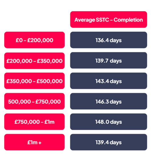 Is this increased cost for higher-priced properties warranted? Well, yes, actually, as the Time to Complete did increase as the price of the property rose. A property priced up to £200,000 takes 136.4 days compared to 148 days for those priced between £750,000 to £1 million (a rise of 11.6 days). However, interestingly, transaction length for properties priced over £1 million buck the trend and transact in 139.4 days on average, a closer timescale to those properties below £350,000! It could be that those properties are bought by cash buyers, so cutting the lender out of the transaction avoids any mortgage delays. Chains are also often shorter for high-end properties, which reduces those chain friction delays. Some high-net-worth individuals also have private solicitors who can further accelerate the process.