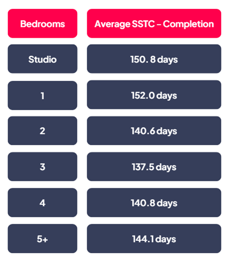 We know that leaseholds take longer, so it makes sense that studios and one-bedrooms (which tend to be flats rather than houses) have the longest transaction timescales at 150.8 days for studios and 152 days for one-beds. We also know that higher-priced properties (aside from those over £1 million) take longer to transact, so it also correlates that those properties with more bedrooms are slower at completing. Properties with five or more bedrooms took 144.1 days compared to just 137.5 days for three-beds, a difference of 6.6 days. The most common property type for the UK is the three-bed, so it’s good news for all that this is the fastest property to transact overall.