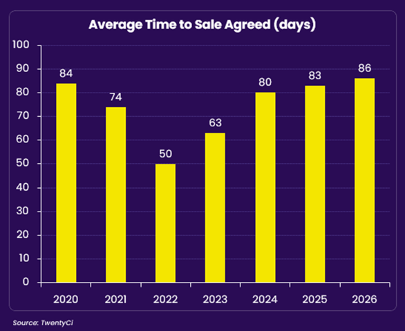 We’re currently observing the Time to Sell rise. In the year-to-date 2026, the average time it takes to secure a buyer is 86 days or 2.8 months. This is a rise of three days year-on-year and six days compared to the same period in 2024. The pandemic skewed results around 2020 to 2022, but arguably, 2023 was closer to a normal year, and even then, the Time to Sell was only 63 days.